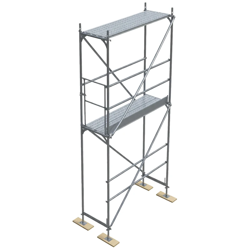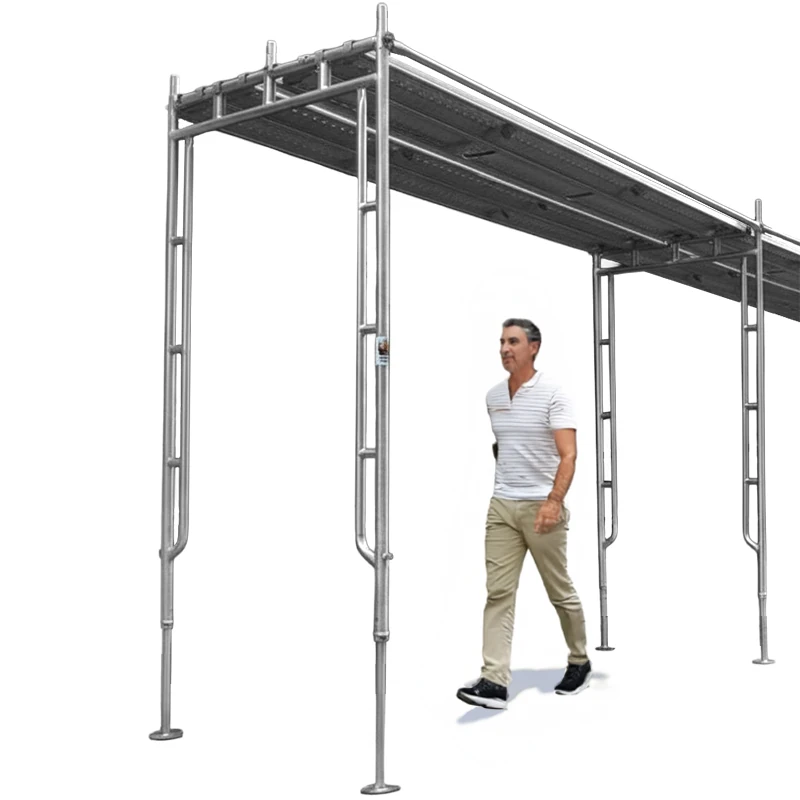Também conhecido como tubular de fachada. Estrutura de quadros fixos, montada em fachadas, com pranchas e travamentos diagonais